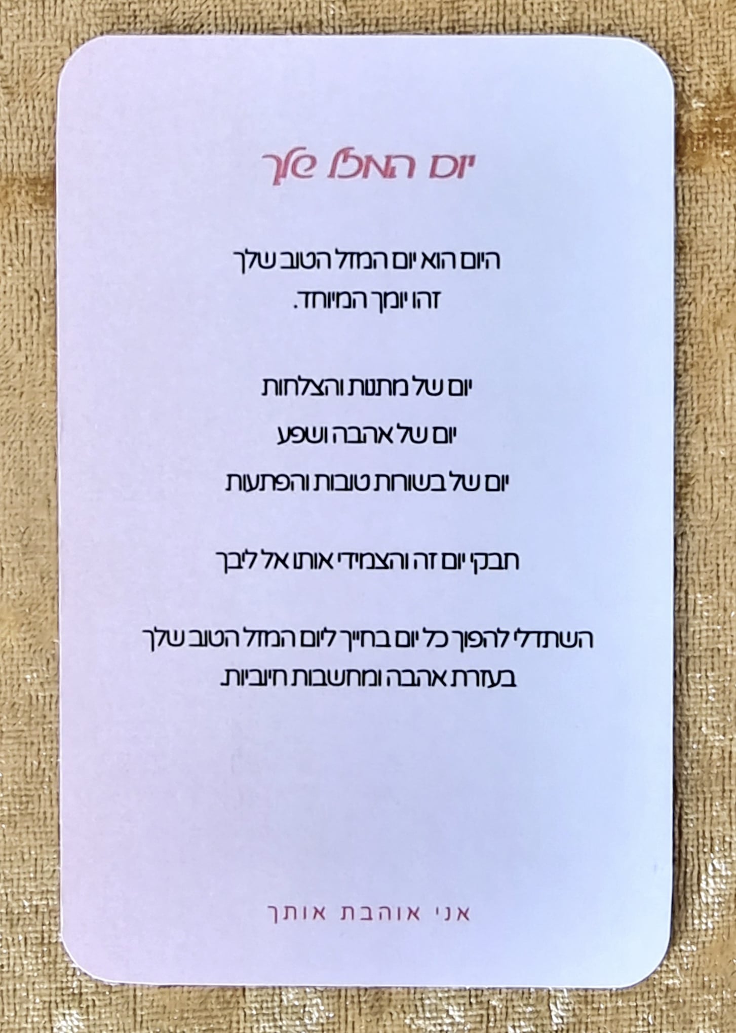 אלו הם 64 מסרי מודעות, שהגיעו אלי יש מאין בתקופת הסגר הראשון של הקורונה. הסגר הזה אשר גרם לכולנו להסתגר, להתבודד ולחשוב על מהות החיים, איפשר לי לחפש את נקודות האור בתוכי ולהתפתח. את חפיסת הקלפים יצרתי בהשראה ולזכרה של אחותי היקרה וילמה שמואל ז"ל, שאהבה מאוד את המשפט "ידע זה כוח" ונהגה לפיו עד יומה האחרון.  אחותי הייתה מקור בלתי נדלה לטיפים מעשיים בכל נושא בעולם – טיפים המשמשים אותנו רבות עד היום. הקלפים הללו נותנים טיפים מעשיים ורוחניים, המביאים למודעות עצמית. ריכזתי בהם מסרים מהעצמי הגבוה, וכן טיפים ותובנות אשר צברתי במהלך השנים. חלק מהמסרים הגיעו אלי בתקשור. הקלפים נועדו להזכיר לכם את מה שאתם כבר יודעים בתוך תוככם, ולעודד אתכם לבצע פעולות פשוטות של שינוי חשיבה, אשר יובילו לשינוי משמעותי בחייכם. הסיסמא שאני מתבססת עליה היא האהבה לכל דבר ועניין בעולמנו – ועל כן קראתי להם "קלפי אני אוהבת אותך". הקלפים מתאימים לכל אדם המעוניין לשנות את חייו לטובה, ולקבל מסרים טובים ומעודדים בכל יום ויום. הקלפים משמשים ככלי עזר רב משמעות למטפלים בקליניקה.